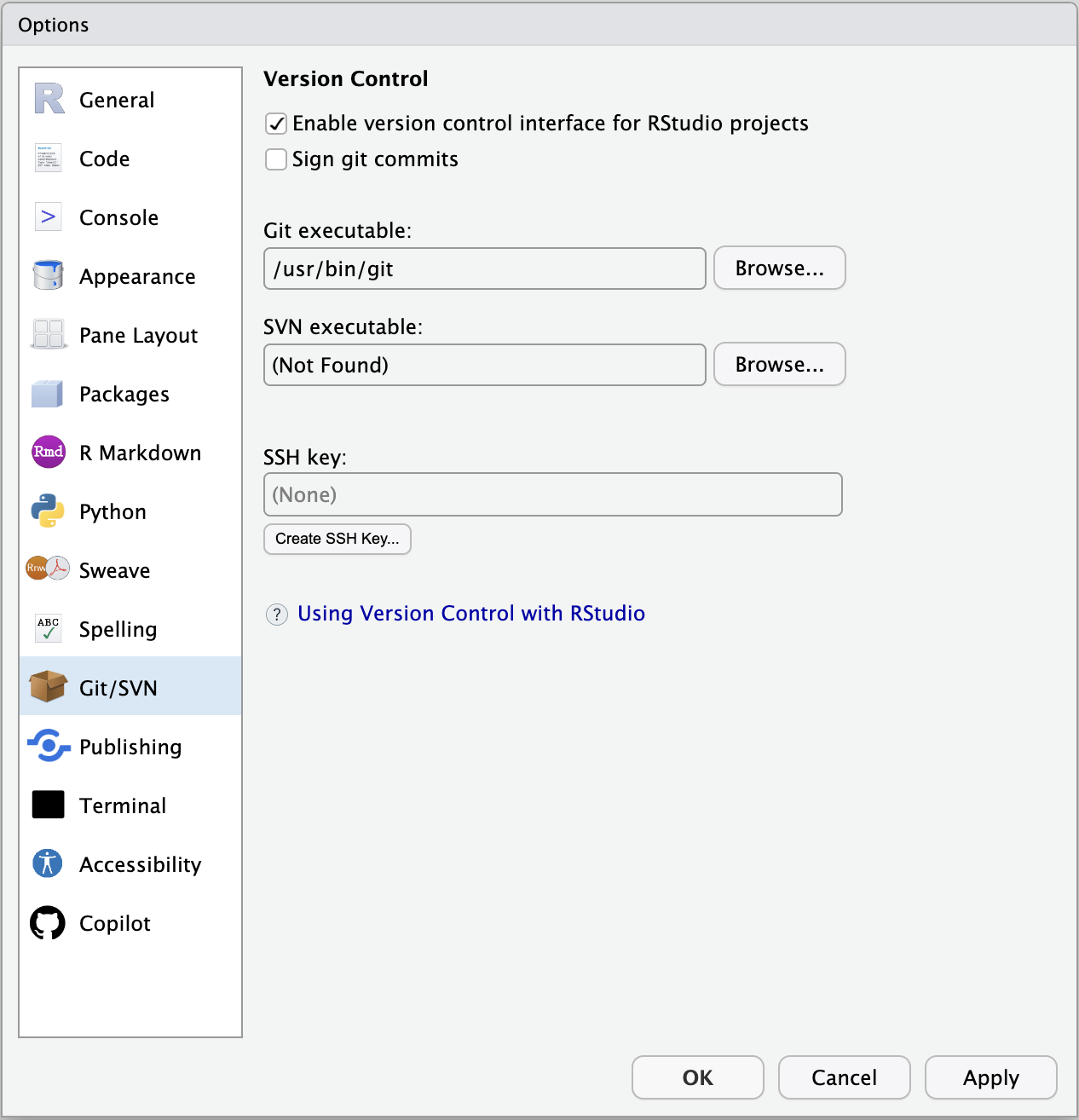 Tools → Global Options → Git: ensure “Git executable” points to your Git (e.g. /usr/bin/git). RStudio will use the same user.name / user.email as the terminal.