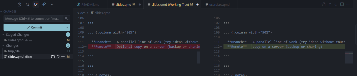 Same Git workflow — status, stage, commit — from your editor instead of the terminal.
